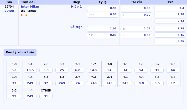 Nhận định kèo Inter Milan vs AS Roma hôm nay 20:00 ngày 27/04 chuẩn cho bạn. Phân tích tỷ lệ kèo Italy dự đoán kết quả tỷ số trận đấu chính xác nhất hôm nay.